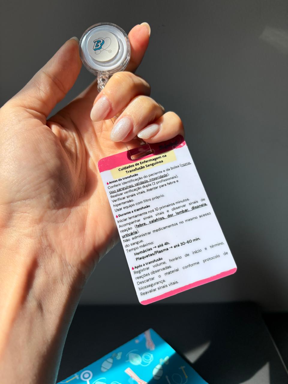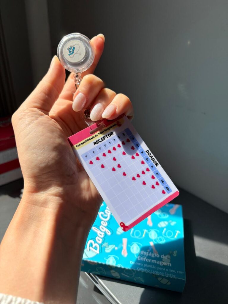 O Badge Card de Transfusão Sanguínea foi desenvolvido para auxiliar o profissional de enfermagem em todas as etapas do processo transfusional — antes, durante e após a administração do sangue.