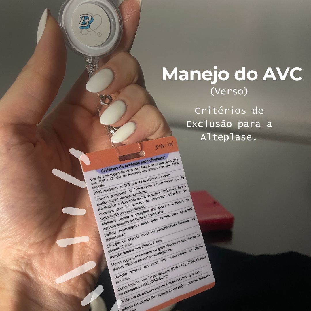 Apresenta a Escala de cincinatti, condutas de manejo incicial, indicação e tempo de trombólise e no verso as contraindicações.